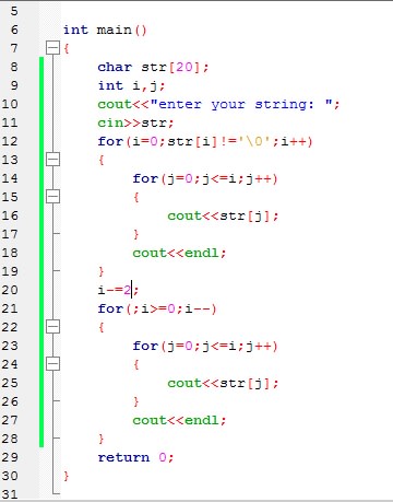 در سوال به شما یک رشته از الفبا داده میشود و از شما خواسته میشود طرح زیر را چاپ کنید. ورودی یک رشته از الفبا که شامل حروف کوچک انگلیسی است. خروجی طرح مثال ورودی نمونه ۱ salam خروجی نمونه ۱ s sa sal sala salam alam lam am m
